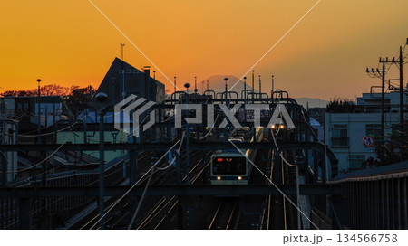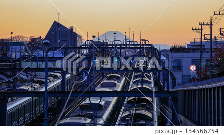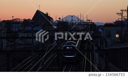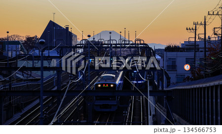 世田谷区立の公園「代田富士356広場」から見た富士山の夕景、小田急の上り下りの電車が並行して走る