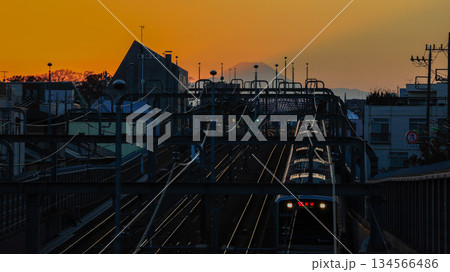 世田谷区立の公園「代田富士356広場」から見た富士山と小田急の下り電車、夕景
