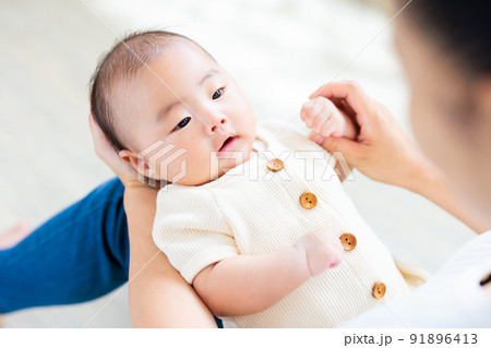 ママの膝の上でのふれあい 生後2ヶ月の元気な赤ちゃん 応援 ガッツポーズ