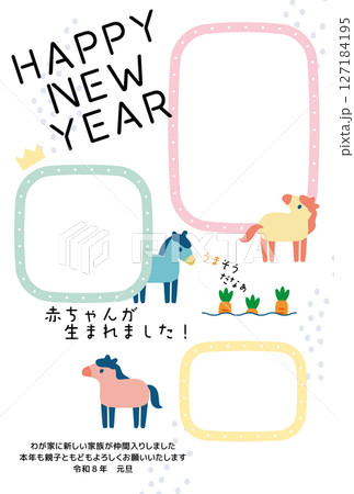 年賀2026 年賀状2026 馬 午 土鈴 親子 ファミリー 干支 かわいい デザイン イラスト素材
