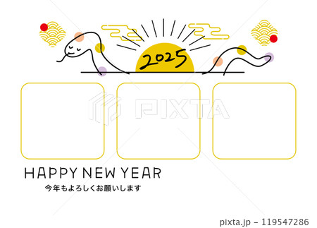 2025年へび年年賀状 手書きのかわいいフォトフレーム 写真年賀状 3箇所 横向き
