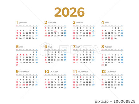 シンプルなデザインの2026年の月曜始まり年間カレンダーの素材
