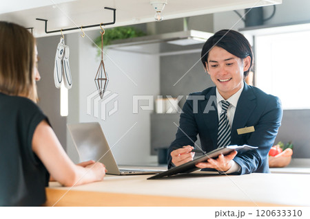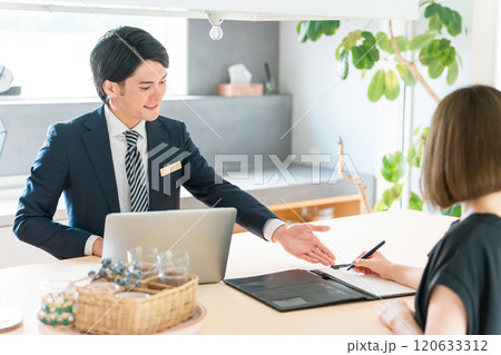 契約書・同意書・書面の説明をするスーツ姿の営業マンと女性顧客