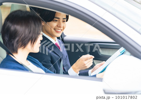 女性に運転を指導する男性 自動車教習所 試乗車 カーディーラー