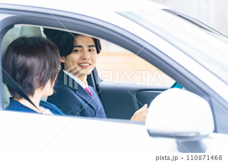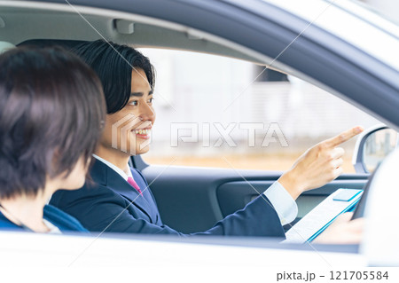 運転指導を受ける男性 自動車教習所 試乗車 カーディーラー