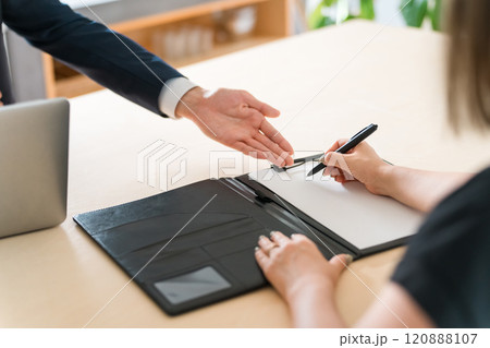 契約書・同意書にサインを求めるスーツ姿の営業マンの男性とサインをする女性客
