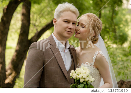 Couple enjoying a romantic moment in a lush outdoor setting during their wedding