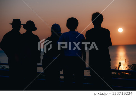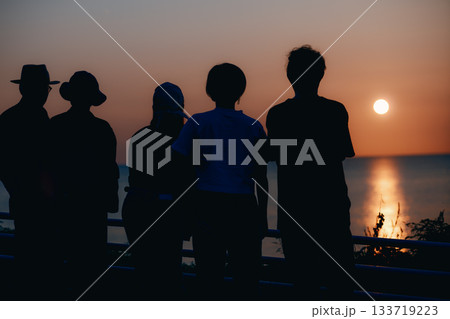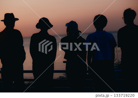 夕日を眺める5人のシルエット