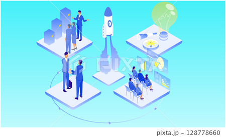 ロケット発射でビジネス加速!成長を描くアイソメ図