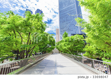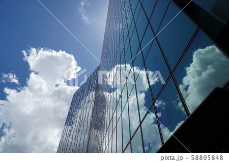 青空を切り取り聳え立つ田町のオフィスビル、昼風景
