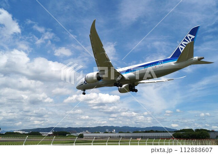 伊丹空港の風景 青空と着陸中の飛行機 大阪府豊中市
