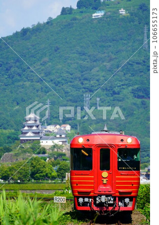 大洲城を背景に松山へと向かう観光列車「伊予灘ものがたり」
