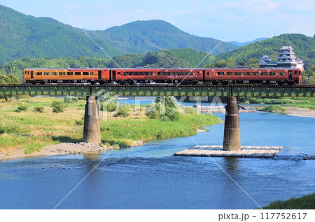 大洲城を背に肱川を渡る観光列車「伊予灘ものがたり」
