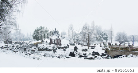 雪景色の中華風の東屋(海容亭)と庭園のパノラマ