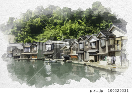 水彩画風 伊根 伊根の舟屋 京都府与謝郡伊根町