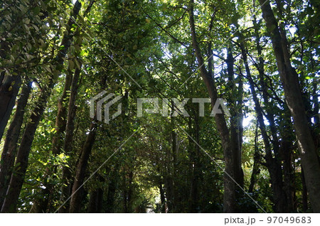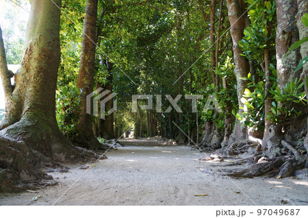 樹齢数百年のフクギの木が並ぶ砂の道を歩く旅ガール、沖縄のパワースポット「フクギ並木」