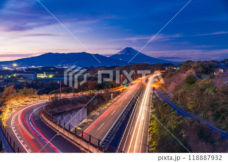 伊豆縦貫道三島塚原インターチェンジから夕暮れの富士山