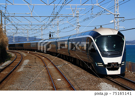 海岸線、根府川駅を通過する特急サフィール踊り子