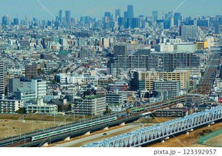 高層ビル群を背に走る特急踊り子、都市の鉄道風景