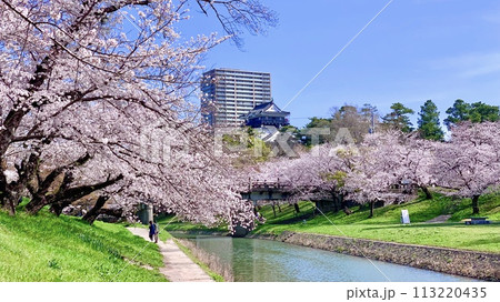 満開の桜並木越しに見える青空と岡崎城天守閣〈岡崎城公園(伊賀川右岸)/愛知県岡崎市〉