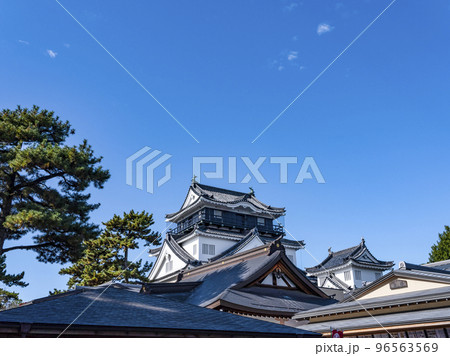 青空に映える満開の桜越しに見る岡崎城天守閣〈岡崎城公園/愛知県岡崎市〉