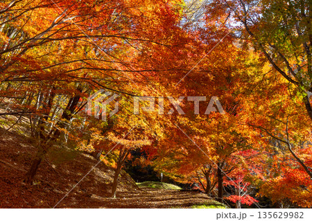 長野県上伊那郡箕輪町東箕輪 紅葉の名所もみじ湖(箕輪ダム)竹の尾広場の鮮やかなモミジのトンネル