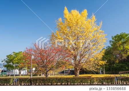 快晴の空に浮かび上がる黄葉したイチョウの大木 京都市伏見区