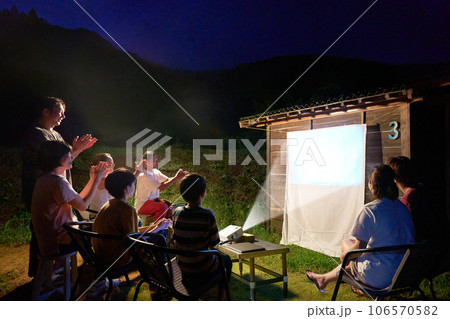 キャンプにてプロジェクターでアウトドアシアターを楽しむ人たち
