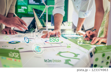 close up diversity team brainstorming focused on ESG (environment,social,governance) for sdgs goals in a sustainable green office