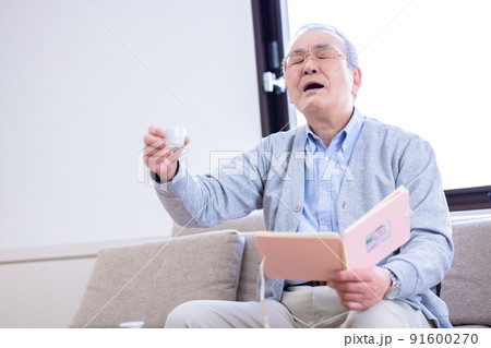 孫の写真を見ながらお酒を飲むおじいちゃん
