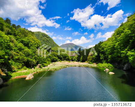 鉄橋が見える阿賀川の美しい自然風景・夏