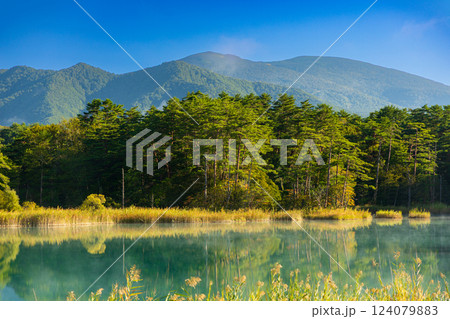 磐梯朝日国立公園 裏磐梯五色沼湖沼群るり沼の気嵐の風景