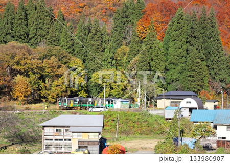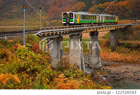 只見線 秋の真奈川橋梁を渡る列車キハE120形と蒲生岳(福島県只見町、10月)