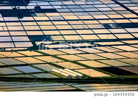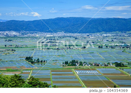 蓋沼森林公園から俯瞰する春早朝の会津盆地田園風景(福島県会津美里町、5月下旬)
