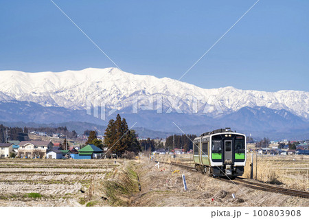 早春の飯豊連峰と只見線の列車 福島県会津美里町