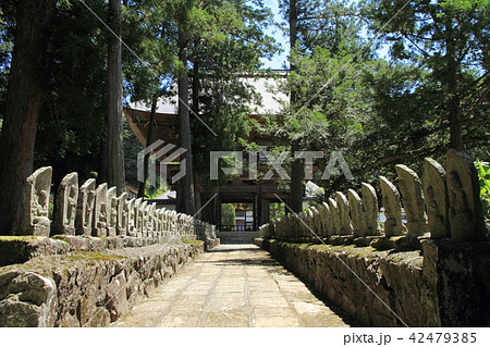 松本市 四賀地区の寺院 廣田寺(こうでんじ) 境内 山門をのぞむ 縦 山門周辺の石仏群が市文化財指定