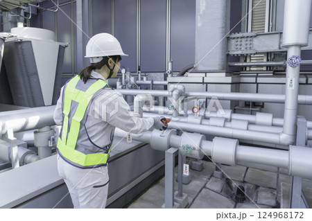 ビルの屋上で点検作業をする若い女性作業員 撮影協力:学校法人電波学園 東京電子専門学校