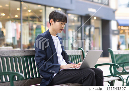 ベンチに座ってパソコン作業をする20代男性