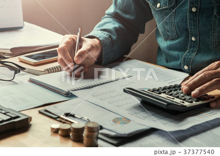 Finance bank tax expense accounting budget money businessman home for Business expense analysis saving use Financial calculate accountant close up calculator with graph chart hand write office desk