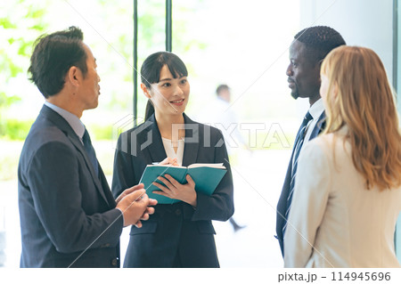 ロビーで会話する多国籍ビジネスパーソンのグループ