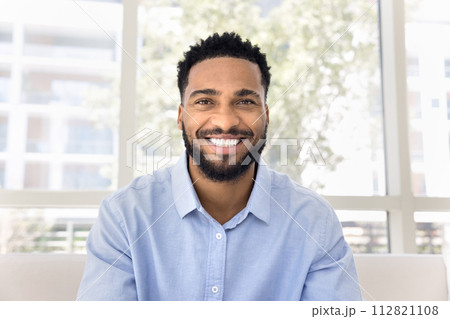 African-American businessman sit on sofa talk with client solve issues distantly through headphones. E-learn with e tutor, improve knowledge use videocall, modern tech concept.