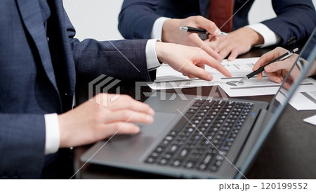 ひざの上でパソコンを使うスーツ姿の男性の手元