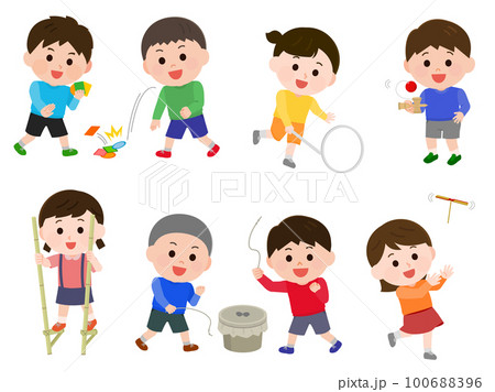 昔のあそびで遊ぶ子どもたち セット メンコ ベーゴマ 竹馬 竹とんぼ リム回し けん玉 イラスト