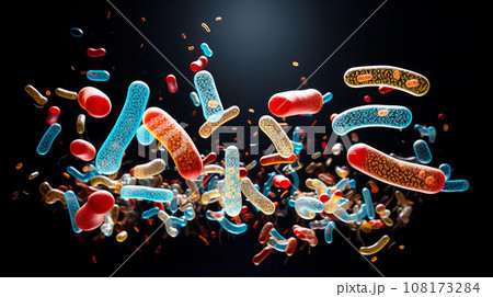 AI-generated content. Visualization of colored bacteria on a black background, Bacterial colony, Microbes