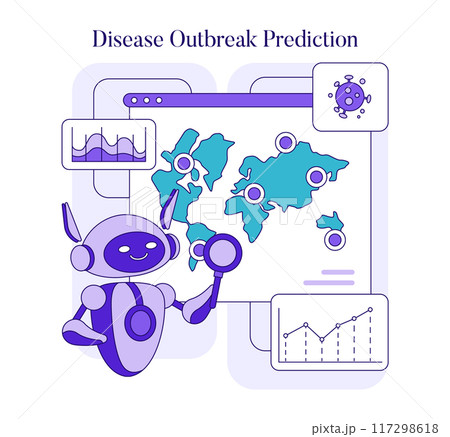 AI Disease Prediction concept. Robot analyzing data on a digital map to forecast epidemics. Vector illustration.