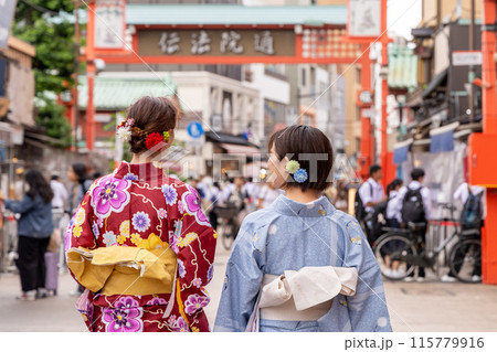 浅草の街並みを散策する着物姿の外国人女性と日本人女性