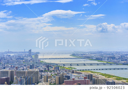 大阪 梅田 梅田スカイビルから見た淀川河口付近と西淀川・尼崎市街地等(西方向、夏)