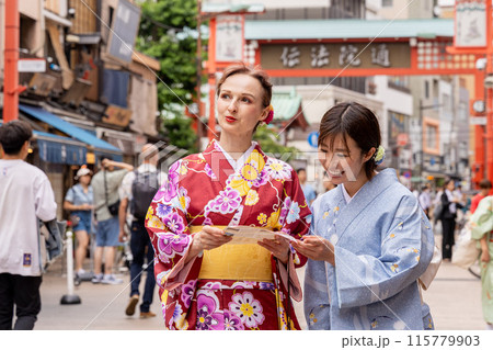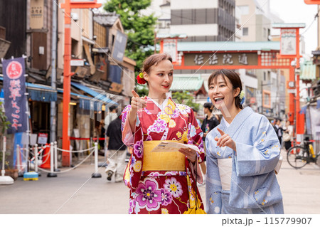 浅草の街並みを散策する着物姿の外国人女性と日本人女性