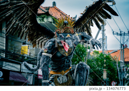 バリ島の伝統的な鳥の神を模した極彩色の装束と横顔
