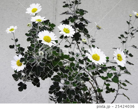 アシズリノジギクは秋遅くに白い花を咲かせる野菊の一種。葉っぱが白く縁取られていて可愛い花である。